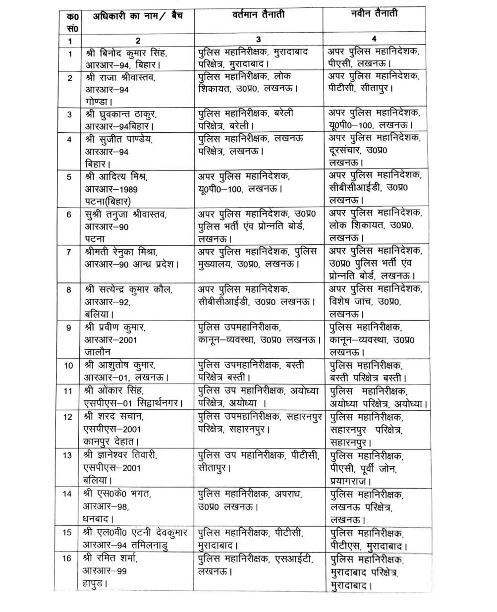 आईजी क्राइम एसके भगत को लखनऊ में आईजी बनाया गया है। एसआईटी के आईजी रमित शर्मा को मुरादाबाद में आईजी बनाया गया है। बरेली में राजेश पांडेय को डीआईजी बनाया गया है। मनोज तिवारी को चित्रकूट धाम रेंज के डीआईजी के पद से हटा दिया गया है। उनके स्थान पर देवीपाटन रेंज के डीआईजी अनिल कुमार राय को भेजा गया है। 35वीं वाहिनी पीएसी लखनऊ में तैनात राकेश सिंह को देवीपाटन रेंज का आईजी बनाया गया है।