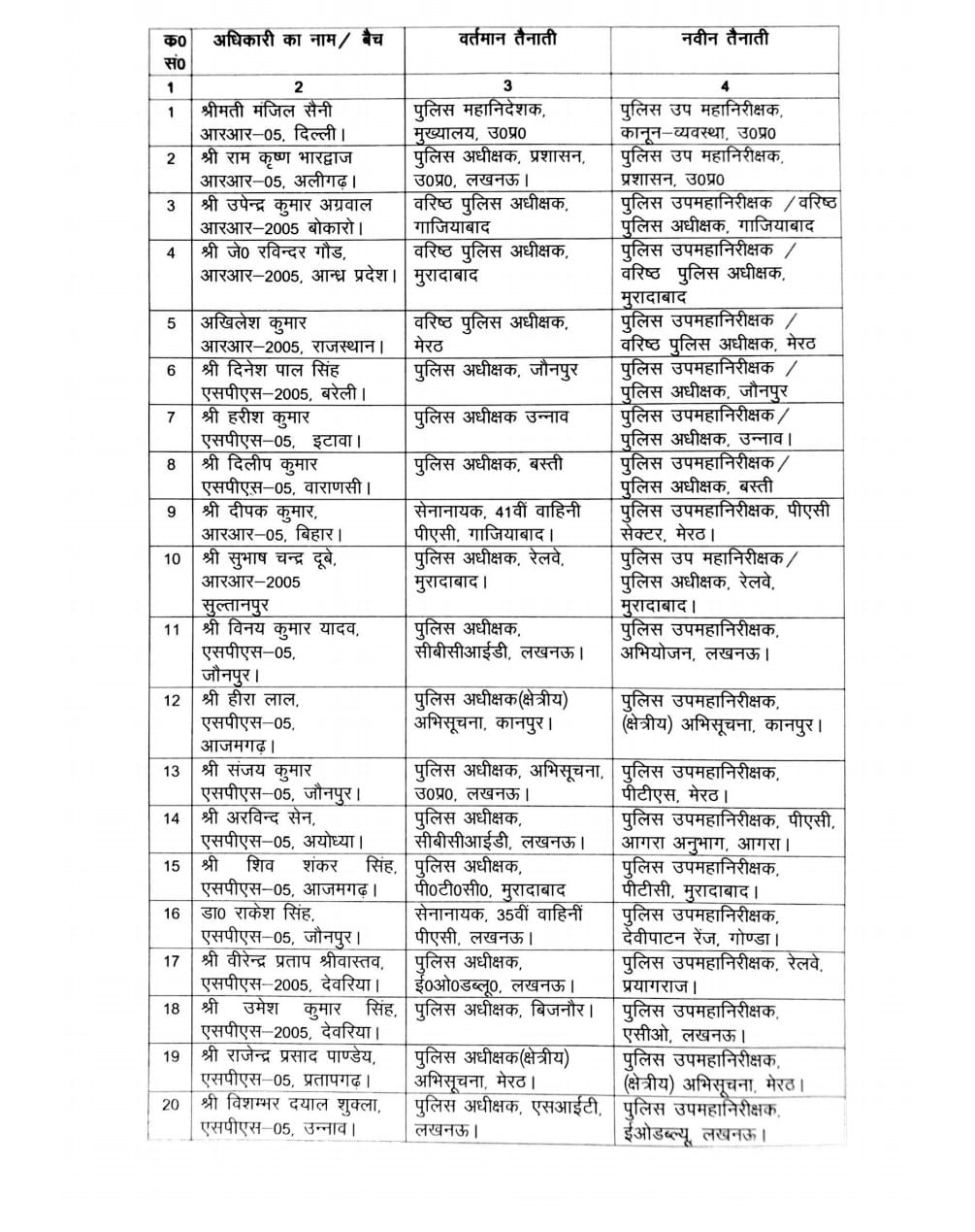 नोएडा के पुलिस कप्तान अजय पाल शर्मा को हटा कर उनके स्थान पर वैभव कृष्ण को जिम्मेदारी दी गई। अजय पाल शर्मा को पुलिस मुख्यालय प्रयागराज में कार्मिक का काम सौंपा गया है। मथुरा के एसएसपी बबलू कुमार को आजमगढ़ का एसपी बनाया गया है। आजगमगढ़ के एसपी रहे रवि शंकर छवि को 24वीं वाहिनी पीएसी मुरादाबाद भेजा गया है। अलीगढ़ के एसएसपी अजय कुमार साहनी को 35वीं वाहिनी पीएसी लखनऊ का सेनानायक बनाया गया है। 24वीं वाहिनी पीएसी के सेनानायक आकाश कुल्हरि को अलीगढ़ का नया एसएसपी बनाया गया है। सत्यार्थ अनिरुद्घ पंकज को मथुरा के नए एसएसपी होंगे। 2013 बैच के सिद्घार्थ शंकर मीणा को हाथरस का एसपी बनाया गया है। हाथरस के एसपी जय प्रकाश का तबादला सीबीसीआईडी कर दिया गया है। पीलीभीत के एसपी बालेंदु भूषण को शासन ने हटा दिया है। उनके स्थान पर मनोज कुमार सोनकर को पीलीभीत का नया एसपी बनाया गया है। देवेंद्र नाथ को बलिया का एसपी बनाया गया है। देवेंद्र नाथ अगस्त माह में पीपीएस से प्रमोशन पाकर आईपीएस हुए थे।